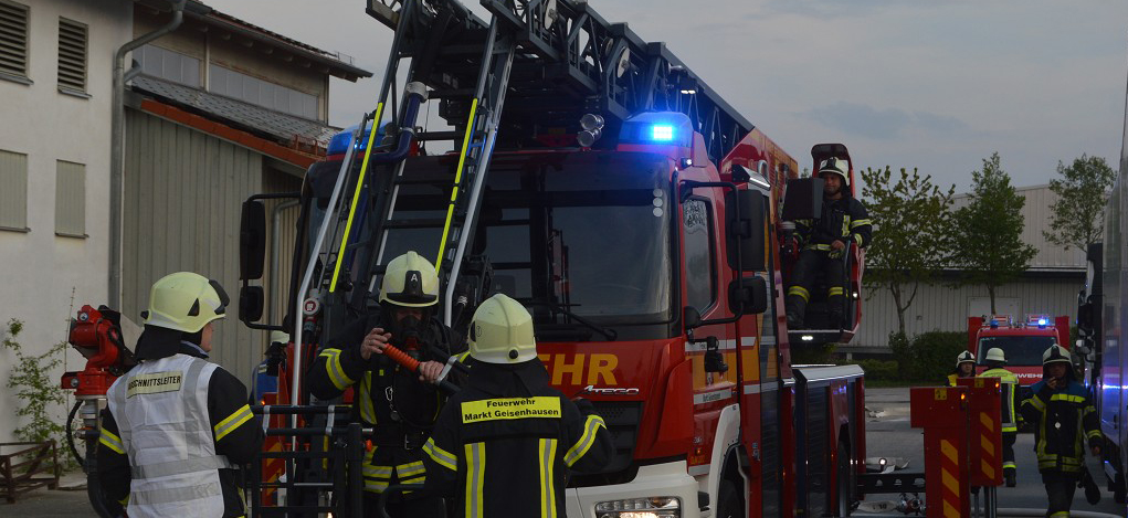 In einer Gemeinschaftsübung rückten die Freiwillige Feuerwehr Geisenhausen und ihre Ortsteil-Wehren von Bergham, Diemannskirchen, Holzhausen und Salksdorf am Freitagabend aus. Gemeldet war ein Vollbrand in den Hallen des Zimmereibetriebs Vögl in der Benzstraße.